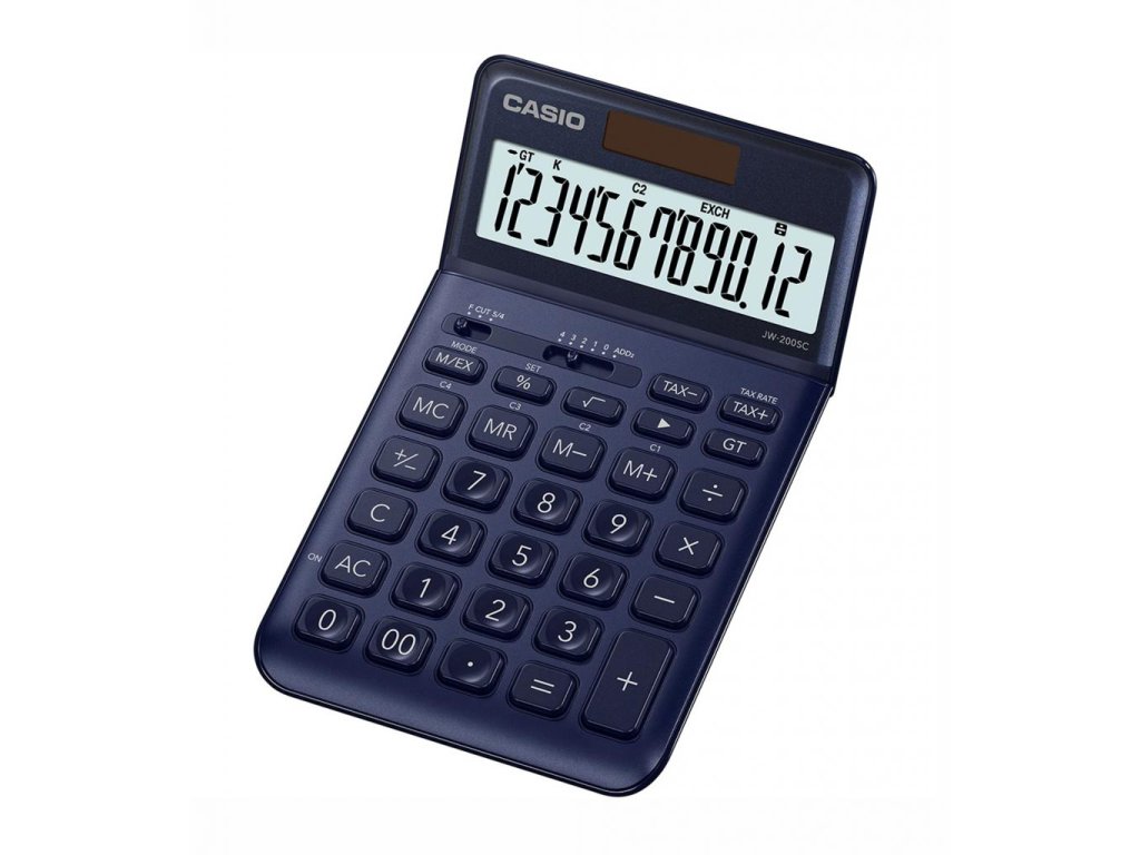 Stolová kalkulačka s veľkým 12-miestnym naklápacím LCD displejom so zobrazením funkcií a kovovým farebným krytom. Opravné tlačidlo a tlačidlá na výpočet odmocniny, daní a prevody mien. Farba tmavomodrá.
