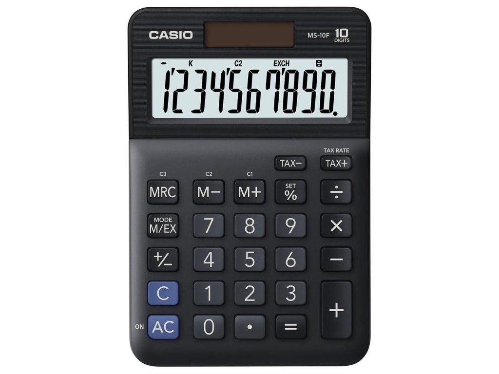 Stolová kalkulačka s veľkým 10-miestnym maticovým displejom, plastovými tlačidlami a pomocnými tlačidlami na výpočet daní. Výpočet %, 3 tlačidlá na prácu s pamäťou, zmeny znamienka +/-, percentuálna marža, zobrazenie použitej funkcie +,, ×, ÷, označenie oddeľovania po tisícoch, ukladanie operácií do vyrovnávacej pamäte, konverzia času, duálne napájanie (solárne + batéria), rozmery 103×145×31 mm.