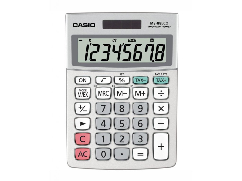 Stolová kalkulačka vyrobená z recyklovaného plastu s batériami bez obsahu ortute. Veľký 8-miestny displej a plastovými tlačidlami. Opravné tlačidlo a tlačidlá na výpočet daní a prepočet až 3 mien.