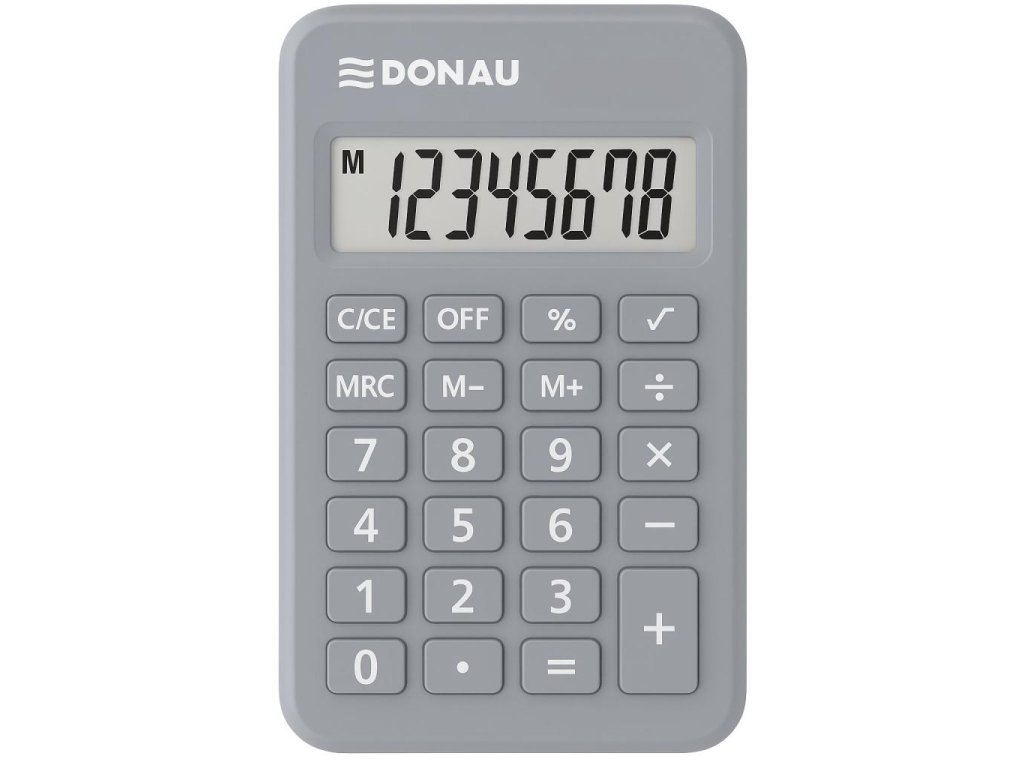 Kalkulačka s 8-miestnym displejom a gumenými tlačidlami. Farba sivá. Záruka 5 rokov.