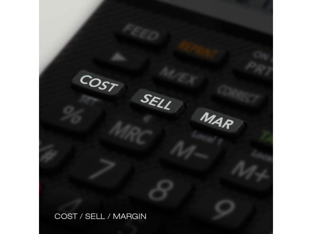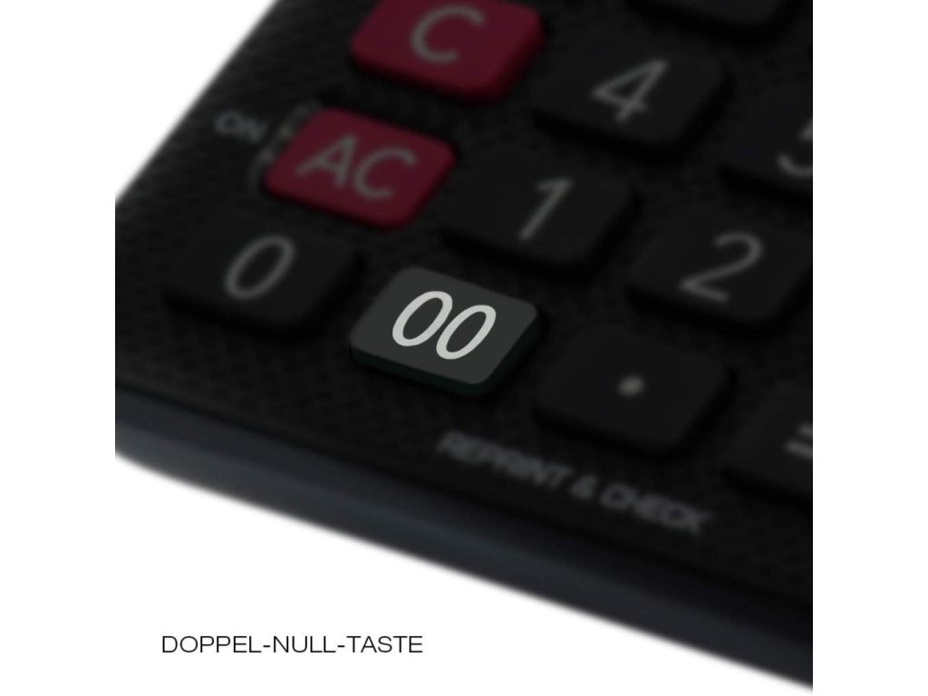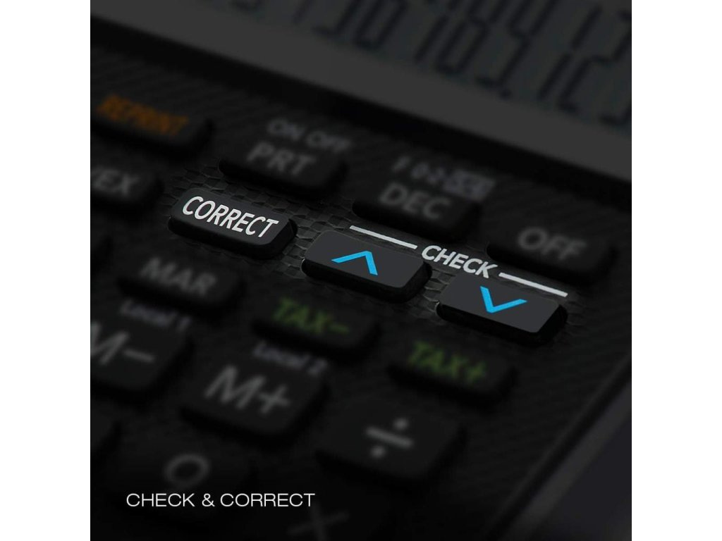 Kalkulačka s tlačou s jednoduchou algebraickou logikou. 12-miestny LCD displej. Napájanie adaptérom alebo batériami, ktoré nie sú súčasťou balenia.
