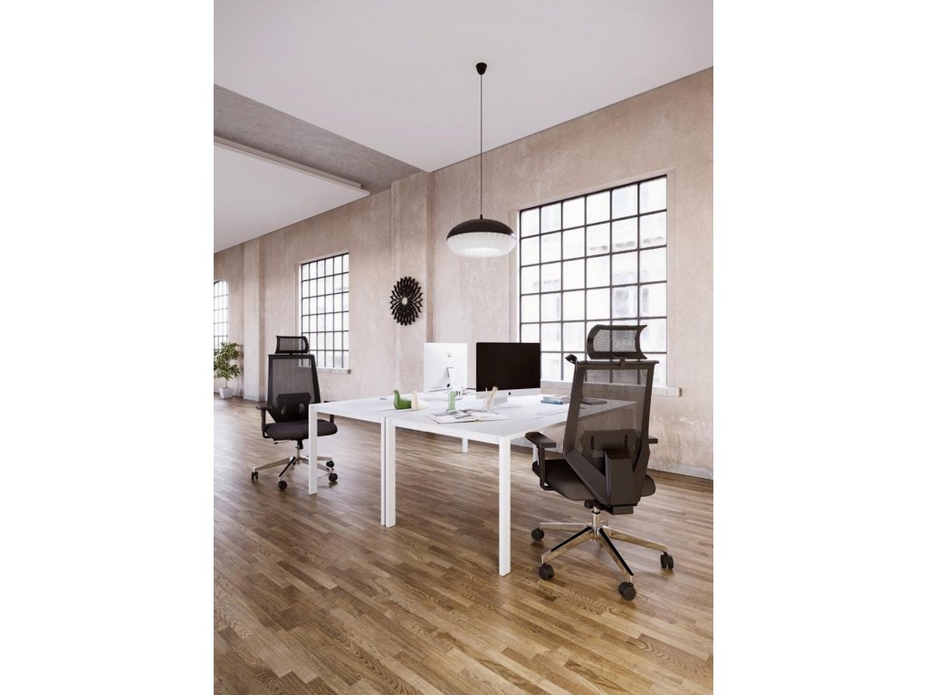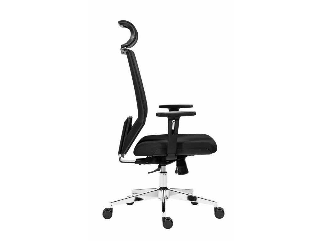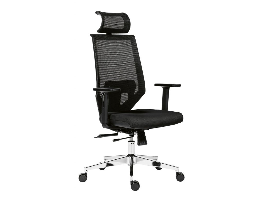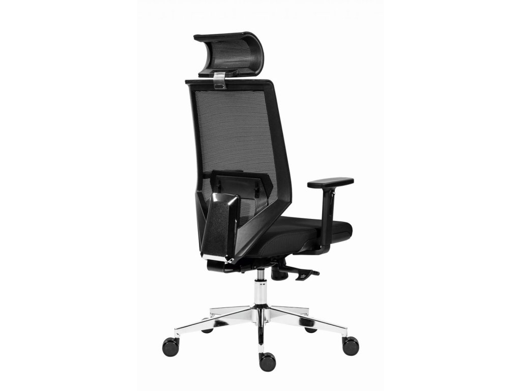 Kancelárska stolička so sieťovaným operadlom a uhlovo nastaviteľným podhlavníkom.