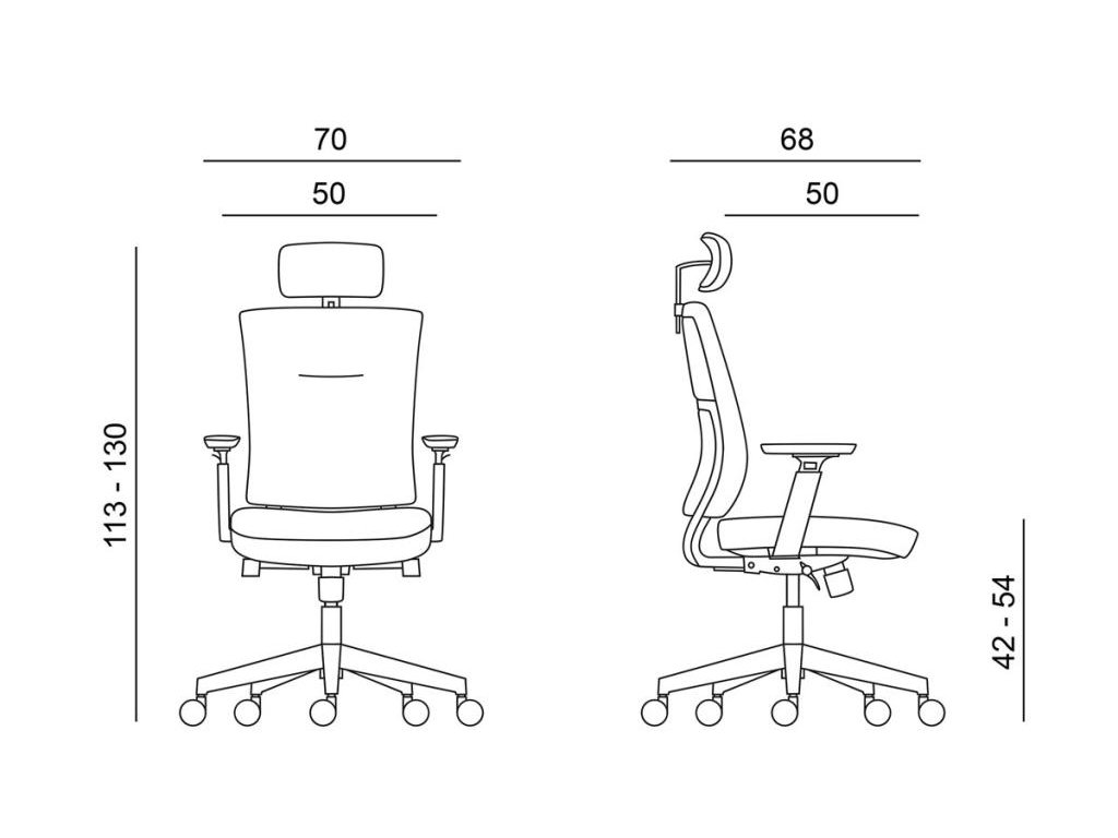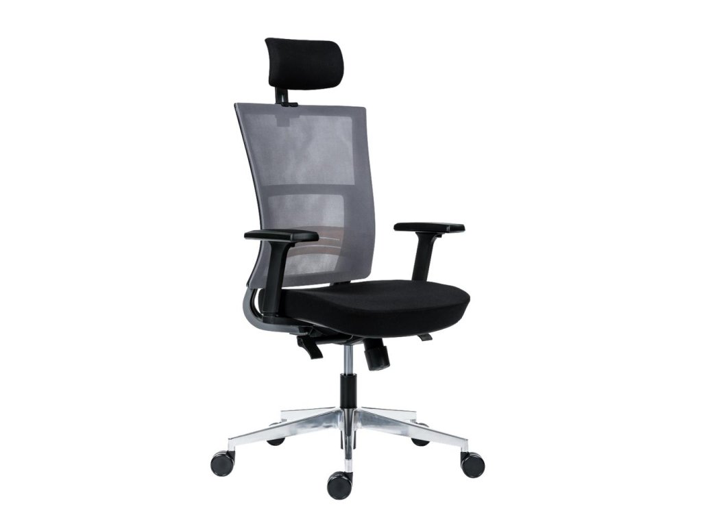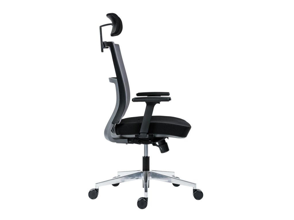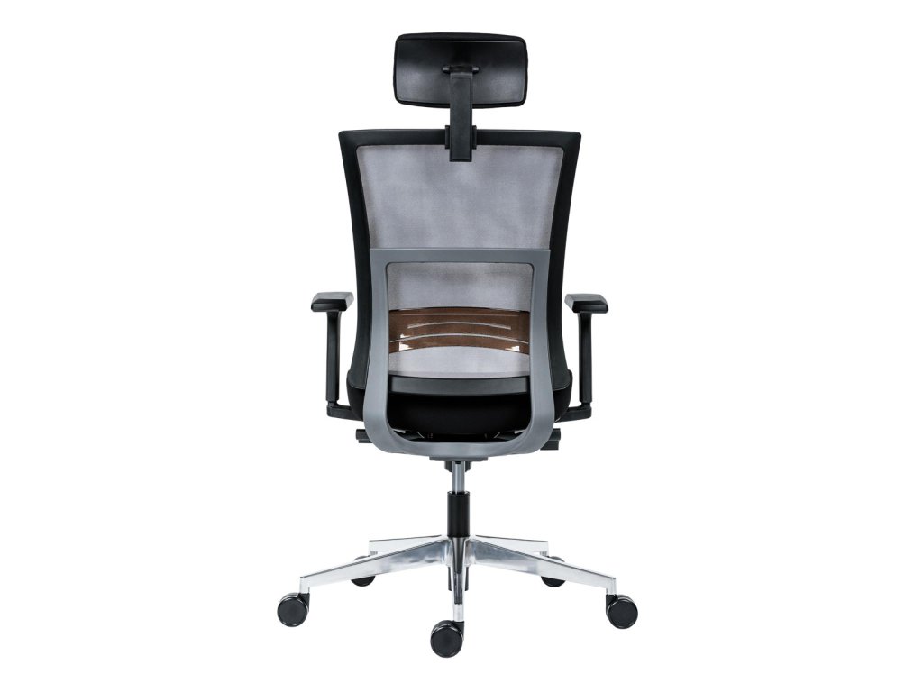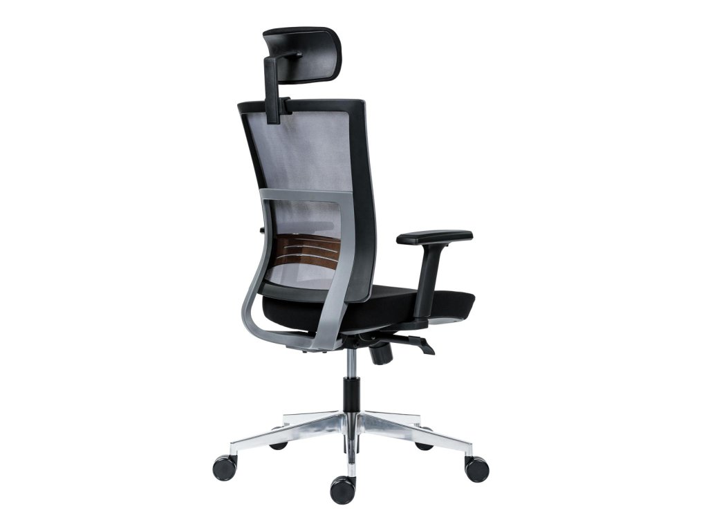 • kancelárska stolička s vysokým priedušným operadlom, opierkou hlavy, podrúčkami a molitánom sedáku zo studenej peny, synchrónny mechanizmus s nastavením sily protiváhy