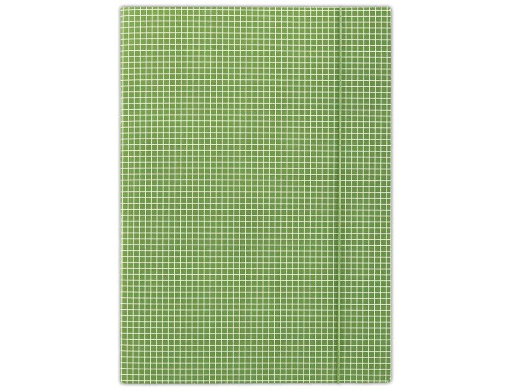 Kartonový obal vyrobený z lepenky s hmotnosťou 400g. Jednostranne potiahnutý vysoko lesklým tlačovým lakom, okrúhla vertikálna guma vo farbe obalu chráni obsah pred vykĺznutím. Károvaná potač. Formát: A4. Farba zelená. Rozmery 232 x 317 mm.