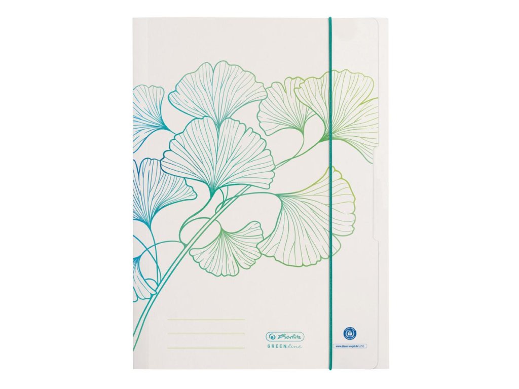 Trojchlopňový obal A4 z recyklovanej lepenky so zatváraním na gumičku dizajnovej radyGREENline. Motív Gingko.