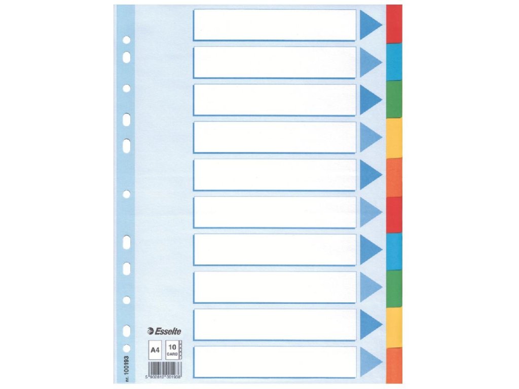 Celofarebný rozraďovač Esselte vyrobený z kartónu v rôznych farbách. Formát A4, eurodierovanie, popisovateľný titulný list na jasnú identifikáciu obsahu. Balenie jedna sada v polyesterovom sáčku. Väčšie balenie 10 sád.