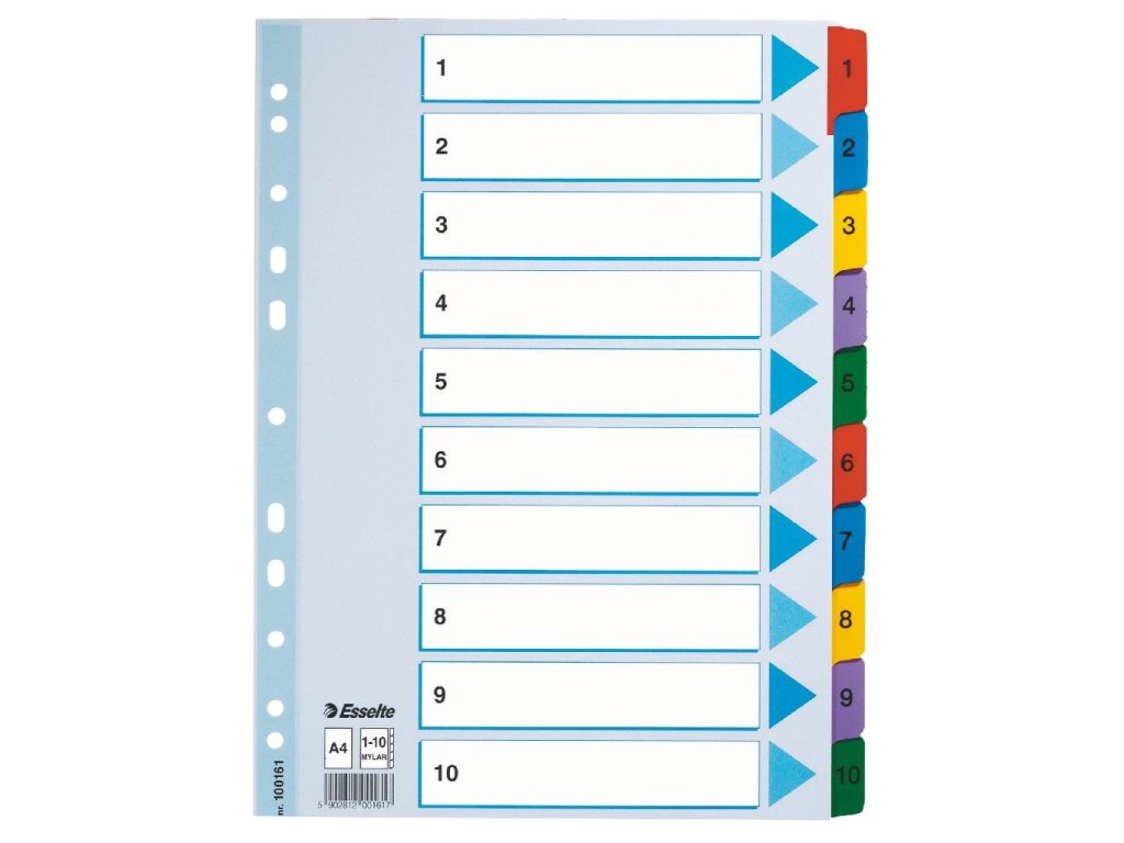 Rozraďovač vyrobený z kvalitného silného kartónu. Formát A4, vystužené eurodierovanie, farebné plastové rozlišovacie okraje, popisovateľný titulný list s farebnou potlačou na jasnú identifikáciu obsahu. Balenie jedna sada v polyesterovom sáčku. Väčšie balenie 10 sád.