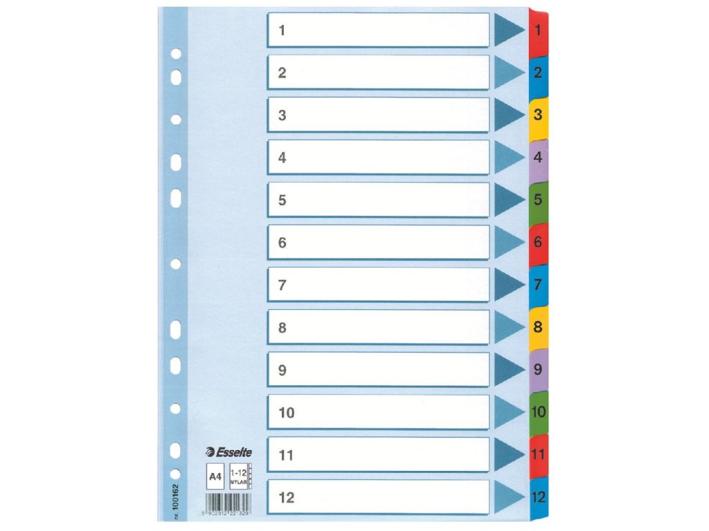 Rozraďovač vyrobený z kvalitného silného kartónu. Formát A4, vystužené eurodierovanie, farebné plastové rozlišovacie okraje, popisovateľný titulný list s farebnou potlačou na jasnú identifikáciu obsahu. Balenie jedna sada v polyesterovom sáčku. Väčšie balenie 10 sád.