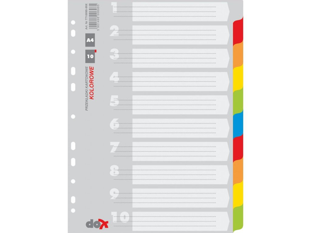 Celofarebný rozraďovač zo 175g kartónu bez popisu. Formát A4, eurodierovanie, titulná papierová strana určená k popisu jednotlivých oddielov. Balenie jedna sada v polyesterovom sáčku. Väčšie balenie 25 sád.
