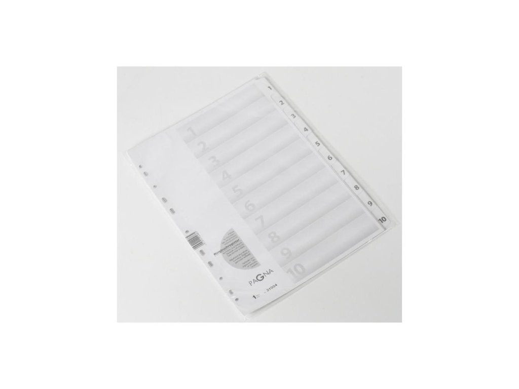 Číselný kartónový rozraďovač. Biele popisovateľné stránky, označené príslušným laminovaným indexom. Euro-dierovanie, biely titulný list. Formát A4, 190 g. Balenie jedna sada v polyesterovom sáčku. V kartóne 20 sád. Farba biela.