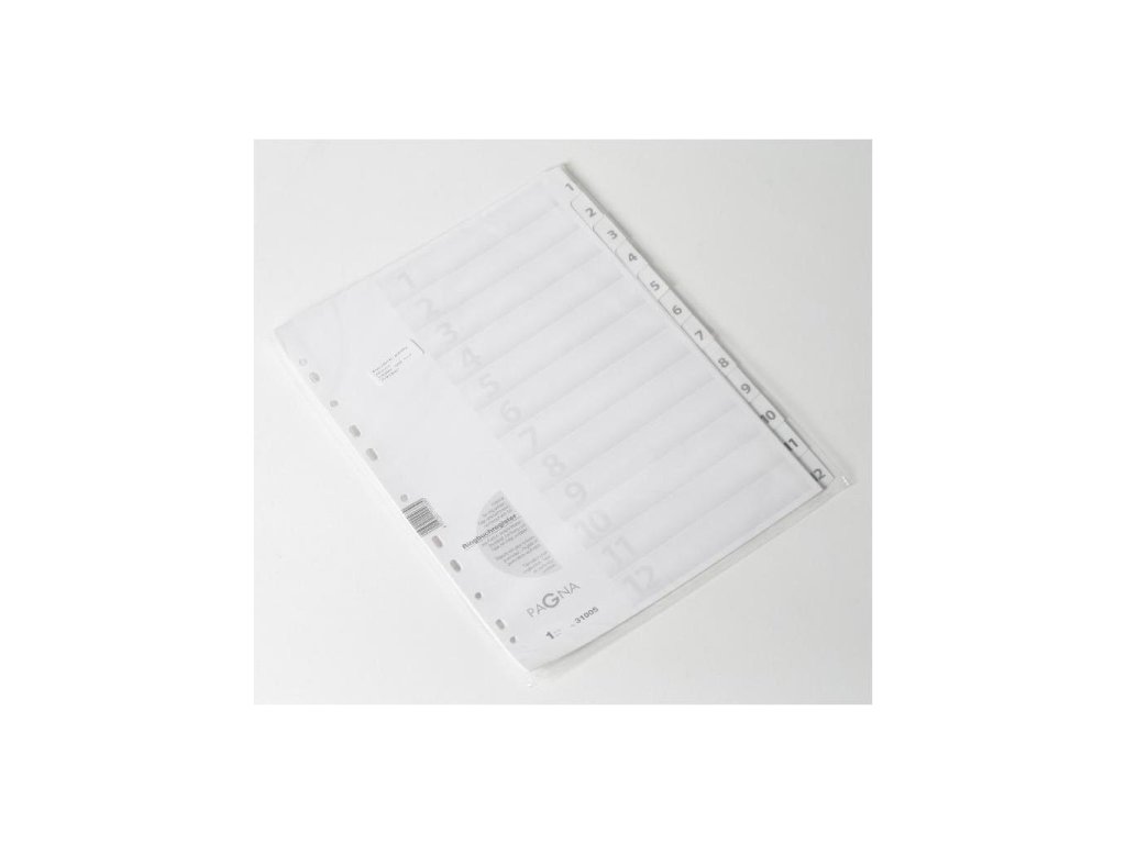 Číselný kartónový rozraďovač. Biele popisovateľné stránky, označené príslušným laminovaným indexom. Euro-dierovanie, biely titulný list. Formát A4, 190 g. Balenie jedna sada v polyesterovom sáčku. V kartóne 40 sád. Farba biela.
