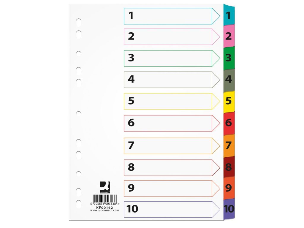 Číselné rozraďovače A4 s laminovanými indexami. Farebné plastové rozlišovacie okraje, popisovateľný biely titulný list s farebnou potlačou na jasnú identifi káciu obsahu. Balenie jedna sada v polyesterovom sáčku. Materiál kartón gramáže 170 g.