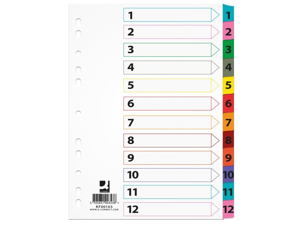 Číselné rozraďovače A4 s laminovanými indexami. Farebné plastové rozlišovacie okraje, popisovateľný biely titulný list s farebnou potlačou na jasnú identifi káciu obsahu. Balenie jedna sada v polyesterovom sáčku. Materiál kartón gramáže 170 g.