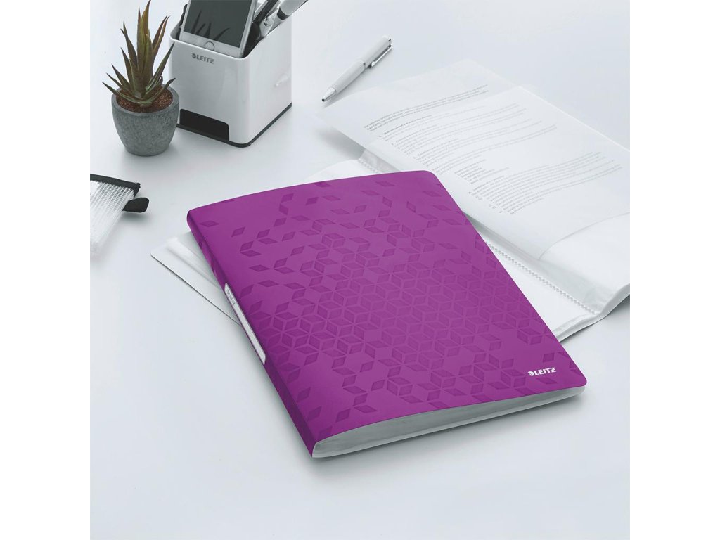 Katalógová kniha na prezentáciu dokumentov formátu A4, do ktorých sa často nahliada. Vyrobená z polypropylénu v dizajne WOW v žiarivých farbách. Vybavená 40 čírymi vreckami hrúbky 45 mic. a samolepiacou chrbtovou etiketou na popis. Väčšie balenie 10 ks. Kapacita 80 listov. Rozmery (š × v × h) 233 × 310 × 16 mm. Farba purpurová.