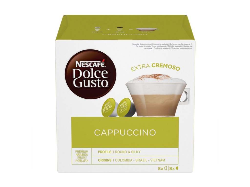 Kávové kapsule NESCAFÉ® Dolce Gusto® Cappuccino vám ponúknu prvotriednu kvalitu, s jednoduchosťou prípravy. Stačí vložiť kapsulu do kávovaru, stlačiť tlačidlo a v zápätí máte dokonalú kávu, s hustou penou, jemnou arómou a zamatovou chuťou. Jedno balenie NESCAFÉ® Dolce Gusto® Cappuccino obsahuje 16 ks kapsúl, z toho 8 na prípravu mliečnej peny a 8 na prípravu 100% kávy Arabica. Spojením týchto dvoch komponentov vznikne lahodná a obľúbená káva cappuccino s bohatou penou.