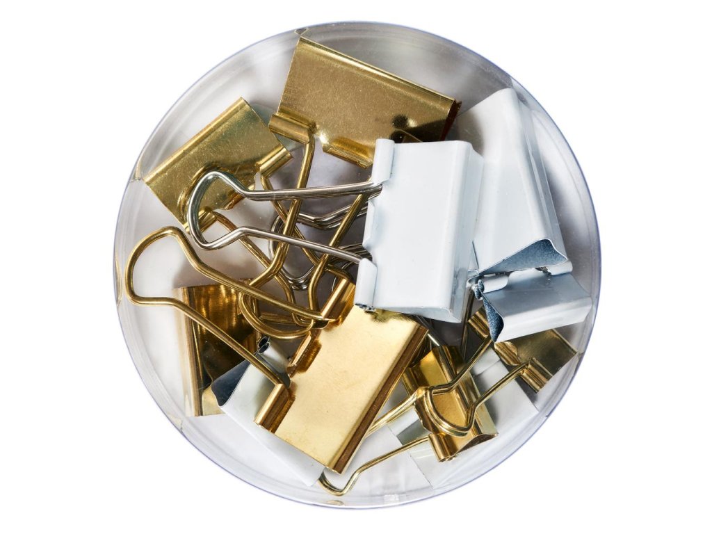 Kovové klipy Pure Glam v zlatej a bielej farbe po 2 z veľkostí 19, 25 a 32 mm. Balenie 12 ks.