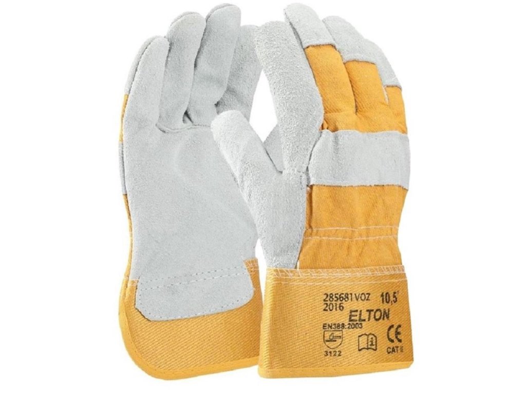 Rukavice s dlaňou z hovädzej štiepanej kože, zadná časť z bavlnenej tkaniny, vystužená manžeta.
