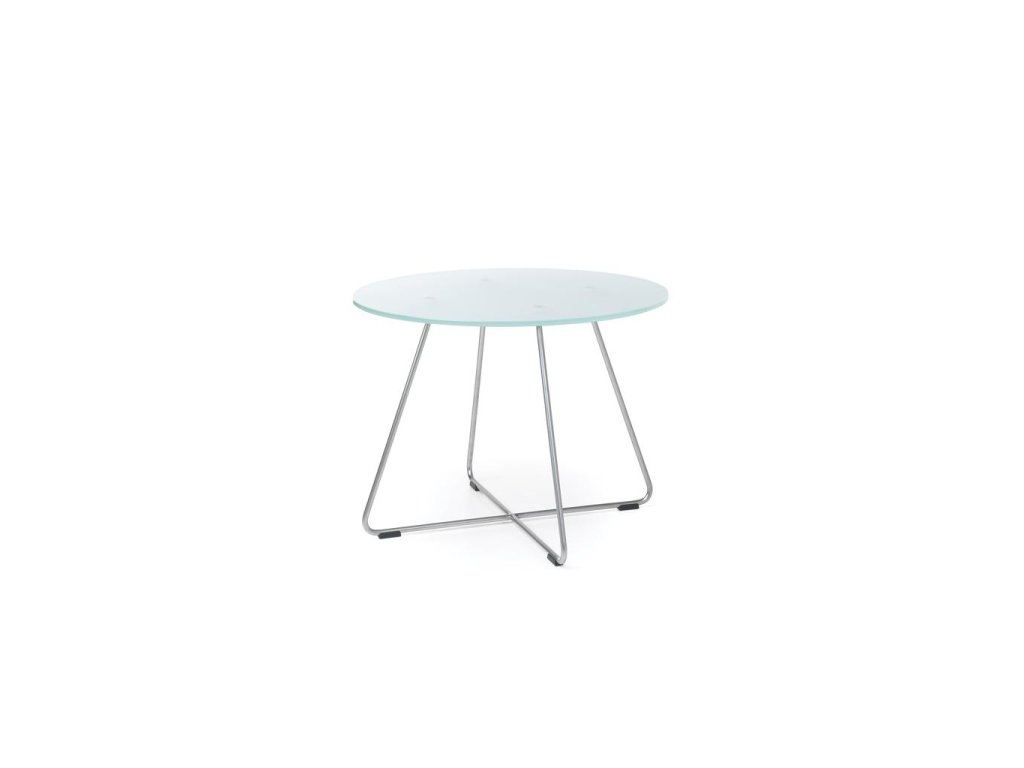 Dizajnový, konferenčný stolík SV40 je v ponuke s okrúhlou doskou, vyrobenou z tvrdeného mliečneho skla s hrúbkou 10 mm.