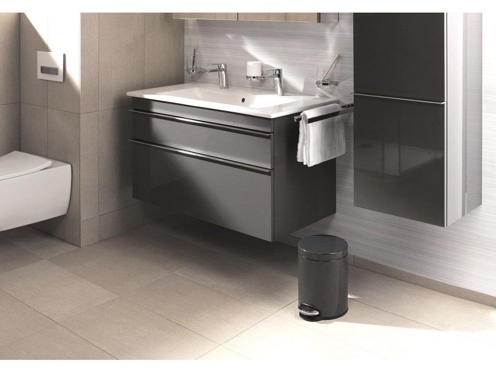 Odpadkový kôš na papier z kovu vybavený vyberateľnou vnútornou nádobou z plastu a plastovou objímkou na vrecko na odpadky. Spodná časť z plastu proti korózii a pre lepšiu stabilitu. Veko na pedál sa zatvára ticho. Objem 5 l, rozmery 260 x 290 mm.