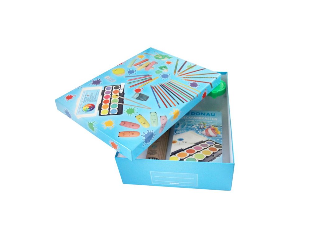 Perfektne navrhnutý box na uskladnenie a organizáciu výtvarných a školských potrieb. Bez problémov sa doň zmestí výkresový blok formátu A4, zošit či zápisník. Vyrobený z pevného kartónu, potiahnutý papierom s lesklým povrchom a praktickou plochou na popis, pevné veko. Rozmery: veko: 33,5 × 24 × 3 cm, box: 33 × 23,5 × 9 cm.