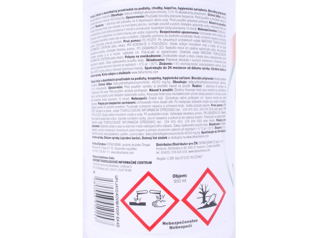 Vlastnosti: KREZOSAN fresh je tekutý čistiaci prostriedok s dezinfekčným účinkom. Slúži na čistenie a dezinfekciu verejných hygienických a zdravotníckych priestorov, na dezinfekciu a čistenie všetkých druhov podláh, chodieb, kúpeľní, sociálnych zariadení, a pod. Krezosan fresh plus má baktericídny účinok (doba pôsobenia 5 minút) a účinok proti kvasinkám (doba pôsobenia 15 minút).
