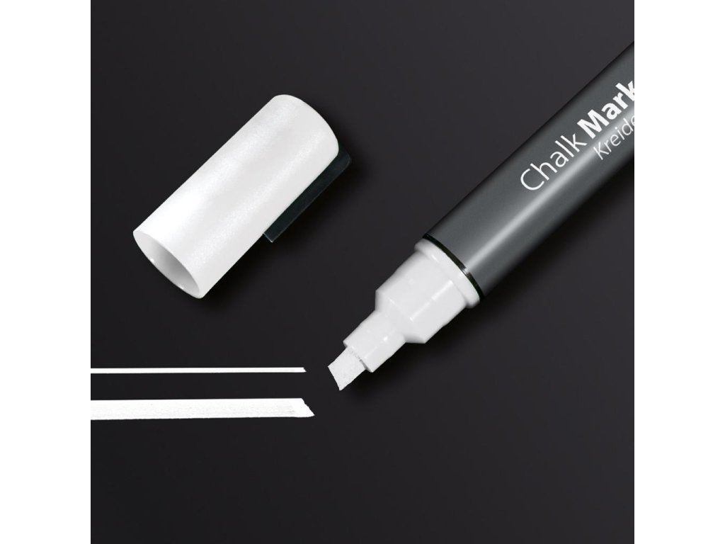 Ľahko stierateľné a vysoko nepriehľadné kriedové popisovače vhodné na sklenené tabule a všetky hladké povrchy podobné sklu. Zrezaný hrot hrúbky 1 - 5 mm. Vodeodolný atrament je zmazateľný vlhkou alebo suchou utierkou. Farba biela.