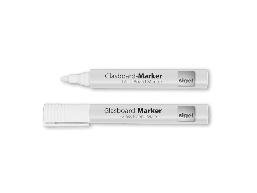 Nepermanentný popisovač vhodný na sklenené tabule, zrkadlá a okná. Guľatý hrot hrúbky 2 - 3 mm. Atrament na báze kriedového pigmentu je zmazateľný vlhkou alebo suchou utierkou. Balenie 2 kusy.
