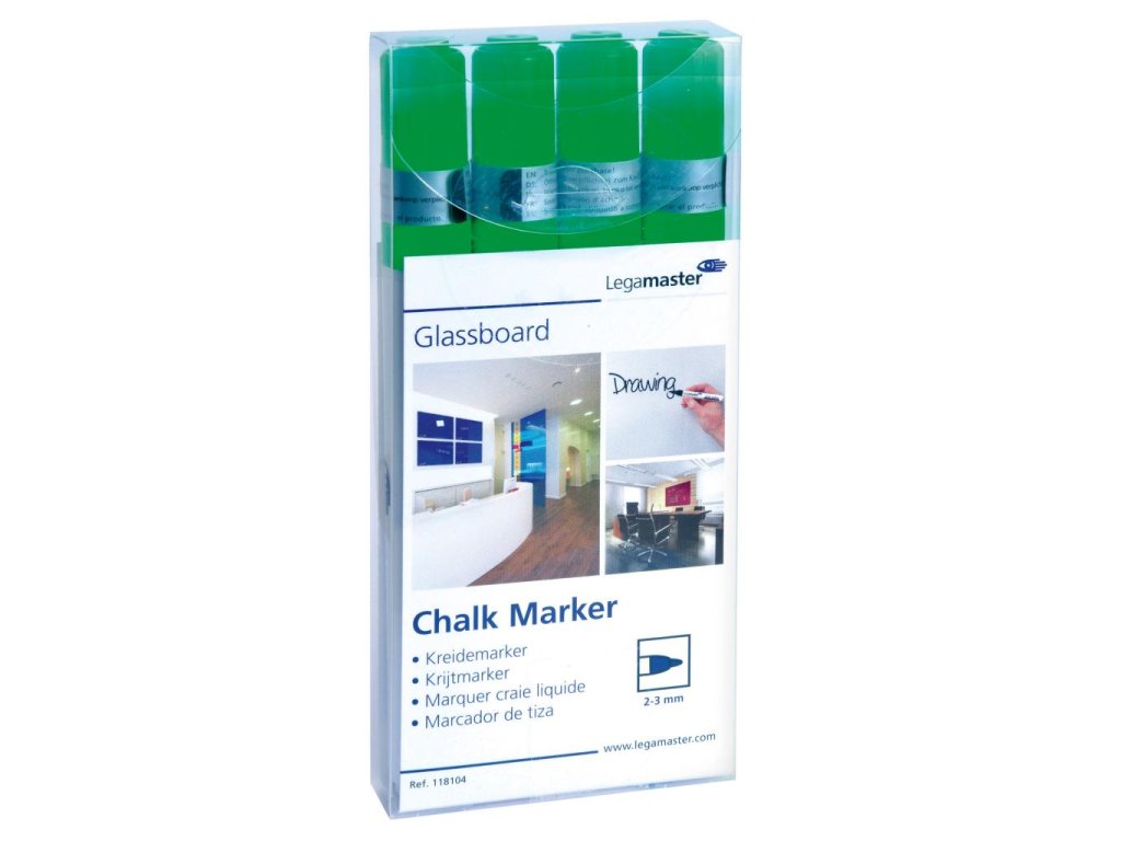 Kriedové popisovače vhodné na sklenené tabule, okná a zrkadlá. Svietiace nepriehľadné farby bez zápachu, stierateľné vlhkou utierkou. Farba zelená. Balenie 4 ks.