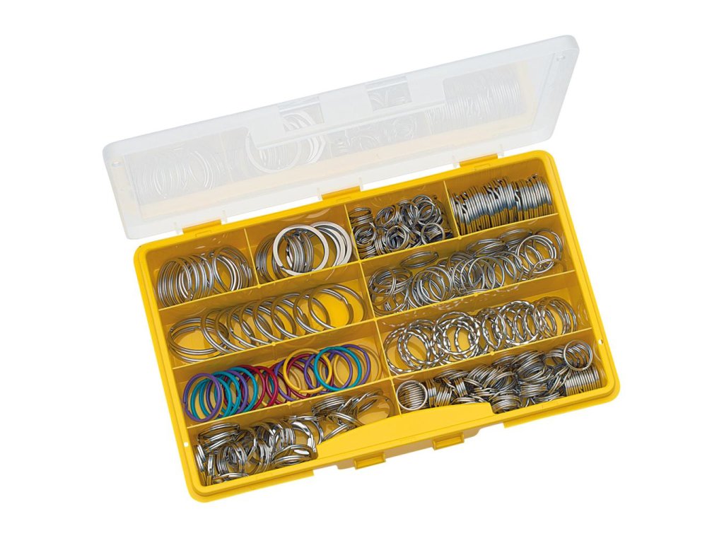 Poniklované kovové krúžky na kľúče dodávané v sade 300 ks v mixe priemerov. Priemery krúžkov: 16, 20, 25, 26, 30 , 35 a 38 mm.