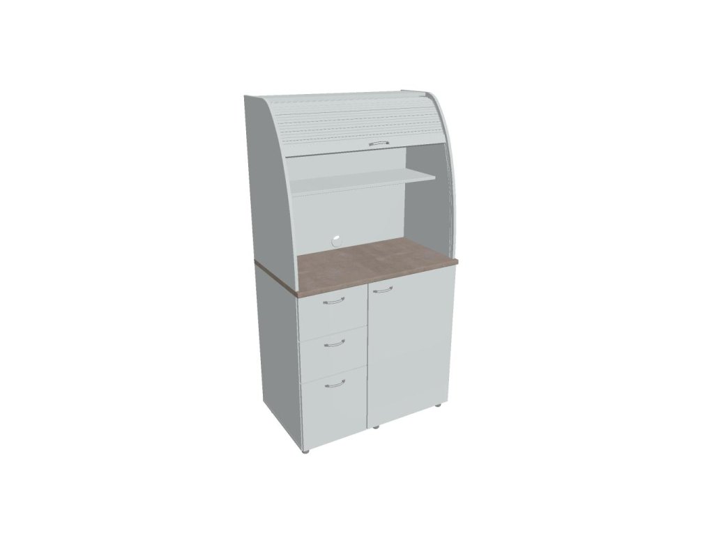 • Dve police vo vrchnej časti kuchynky poskytujú dostatočnú kapacitu na poháre, šálky a taniere. Na pracovnú dosku môžete umiestniť napr. kávovar a káblovou priechodkou v zadnej časti vyvediete kábel z priestoru kuchynky.