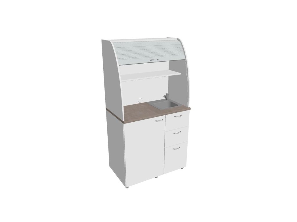 • Dve police vo vrchnej časti kuchynky poskytujú dostatočnú kapacitu na poháre, šálky a taniere. Na pracovnú dosku môžete umiestniť napr. kávovar a káblovou priechodkou v zadnej časti vyvediete kábel z priestoru kuchynky.