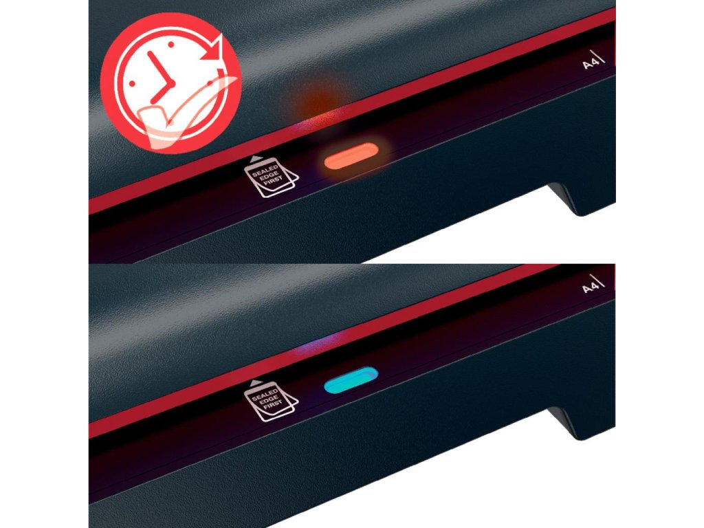 • LED dióda stavu SMART: počas zahrievania svieti načerveno a zmodrie so zvukovým signálom, keď je laminátor pripravený na použitie