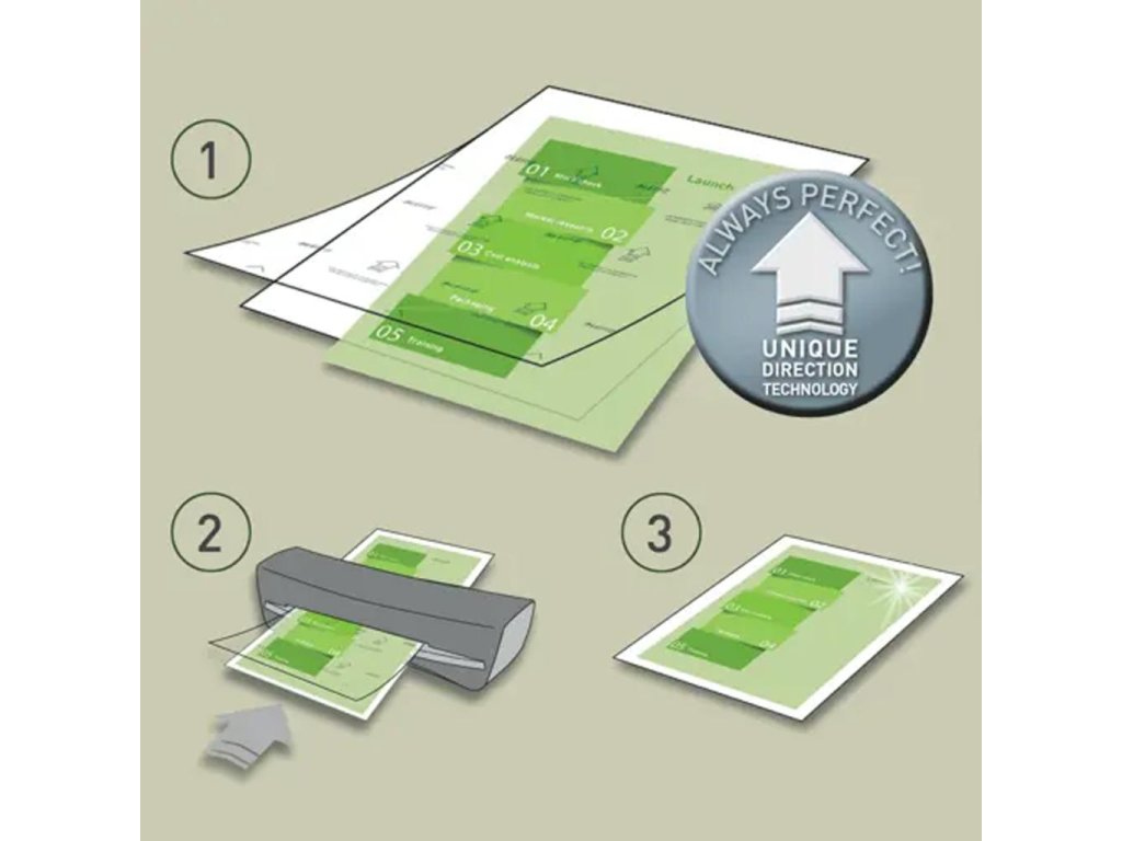 - Unikátna smerovacia technológia navádza k správnemu vloženiu obalu v smere šípok, ktoré sú umiestnené na obale a ktoré po laminácii zmiznú