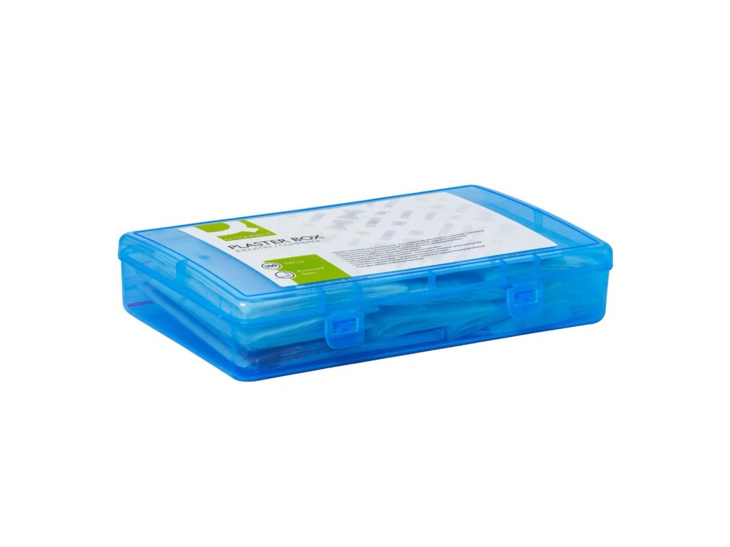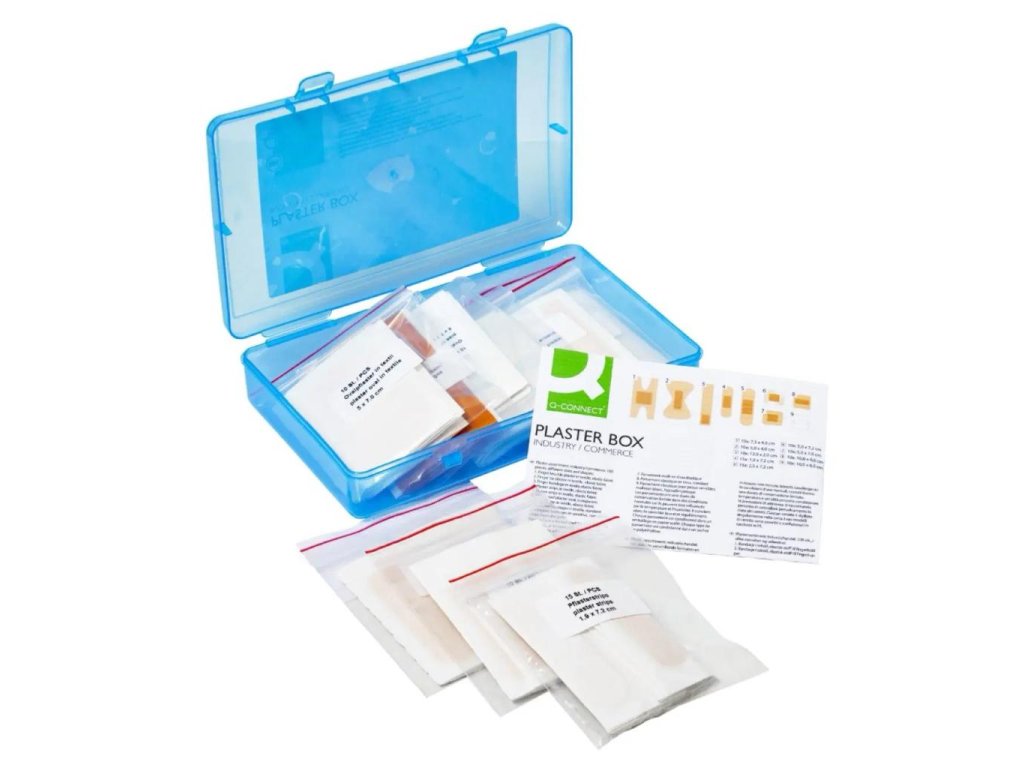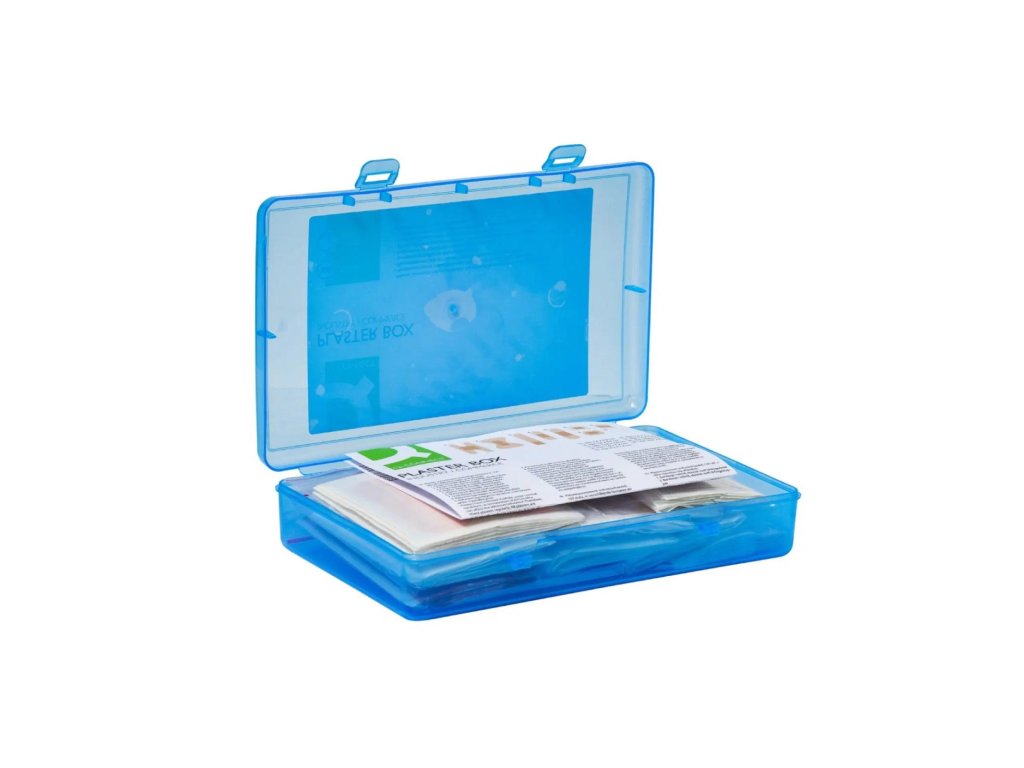 Ideálne na drobné poranenia v reštauráciách a obchodných prevádzkach. Praktická, uzatvárateľná plastová krabička. Obsah: - 10 bandáží na kĺby prstov (7,5 x 4 cm) z textilnej elastickej látky. - 10 obväzov na končeky prstov (5 x 4 cm) z textilnej elastickej látky. - 10 obväzov na prsty (12 x 2 cm) z textilnej, elastickej látky. - 15 malých sadrových pásikov (1,9 x 7,2 cm) z textilnej elastickej látky. - 15 sadrových pásikov (2,5 x 7,2 cm) z textilnej, elastickej tkaniny. - 10 vodotesných oválnych náplastí (5,0 x 7,2 cm) transparentných. - 10 oválnych náplastí (5 x 7 cm) z textilnej, elastickej tkaniny. - 10 obväzov na rany (10 x 6 cm) z textilu, štandard. - 10 citlivých obväzov na rany (10 x 6 cm), biele fleece, hypoalergénne. Rozmer (ŠxVxH): 20,8 x 4,4 x 13,2 cm. Hmotnosť: 226 g. Farba: modro-transparentná