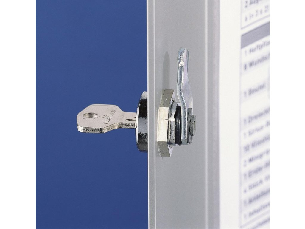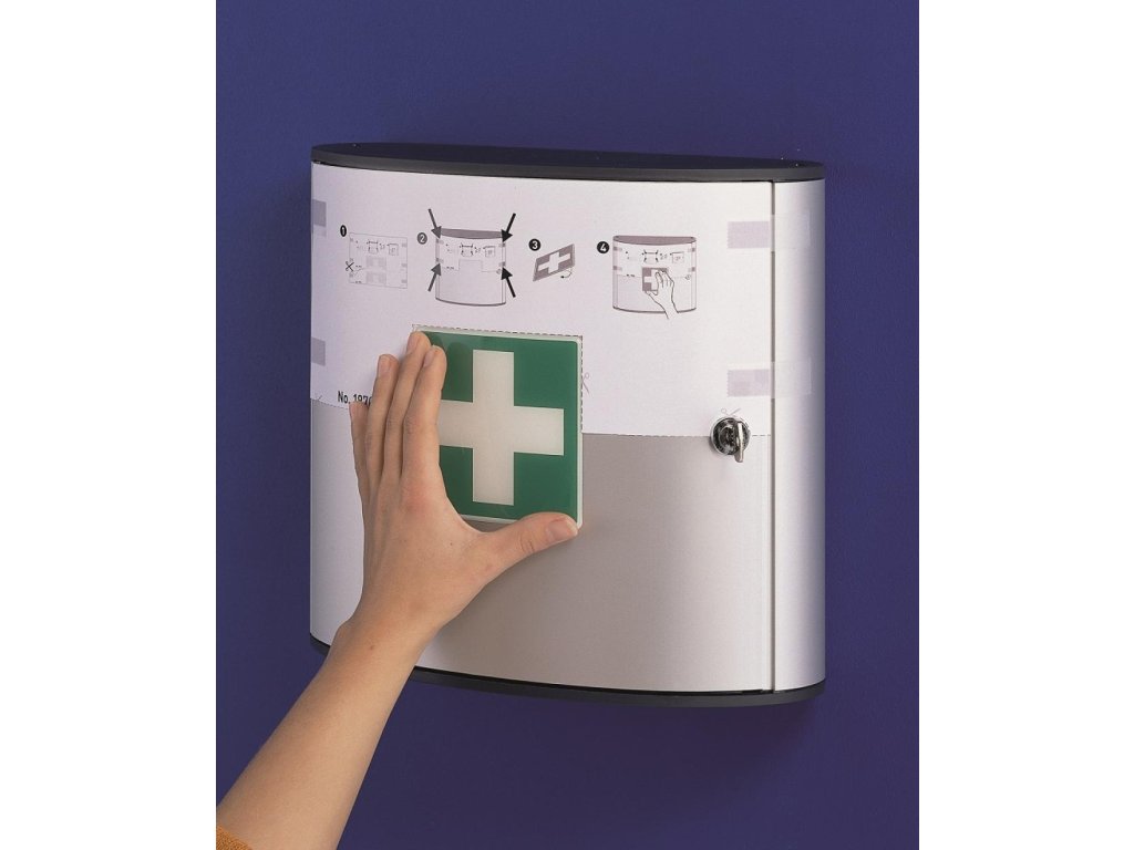 Malá lekárnička prvej pomoci v dizajne skriniek na kľúče. Dvierka, otvárajúce sa z dôvodu lepšej obsluhy v 180° uhle, 2 priehradky na základné lieky, obväzy, náplaste a nožnice. Materiál vysokokvalitný hliník. Dodávaná bez náplne s montážnou sadou na stenu.