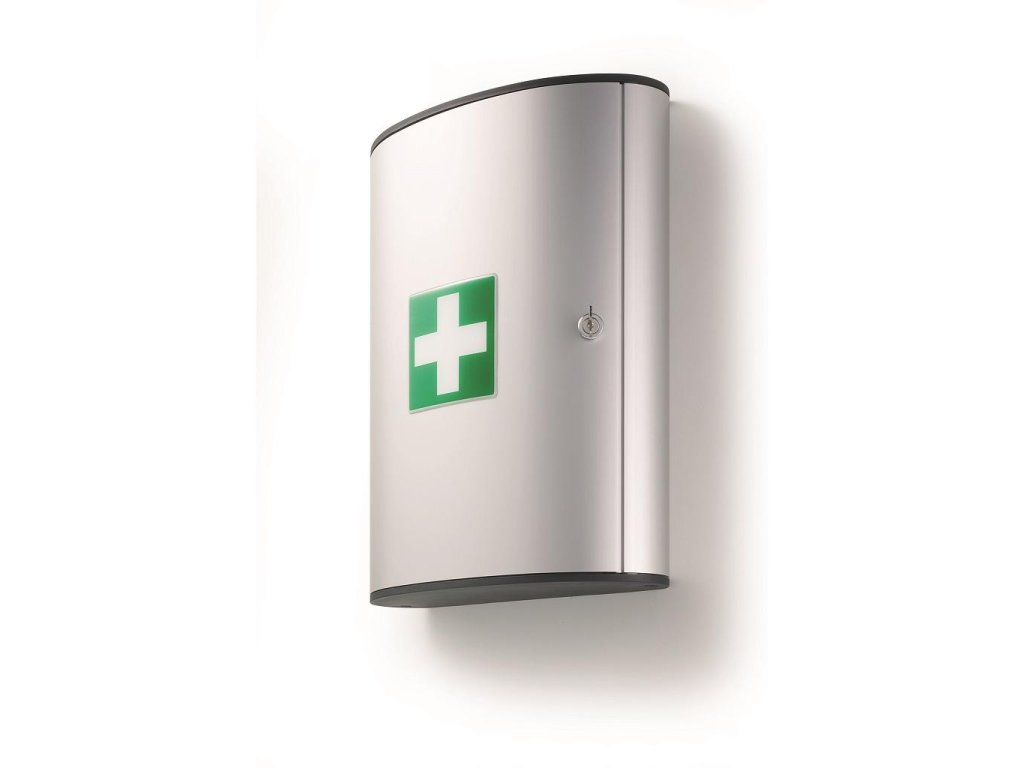 Malá lekárnička prvej pomoci v dizajne skriniek na kľúče. Dvierka, otvárajúce sa z dôvodu lepšej obsluhy v 180° uhle, 3 priehradky na základné lieky, obväzy, náplaste a nožnice. Materiál vysokokvalitný hliník. Dodávaná bez náplne s montážnou sadou na stenu.