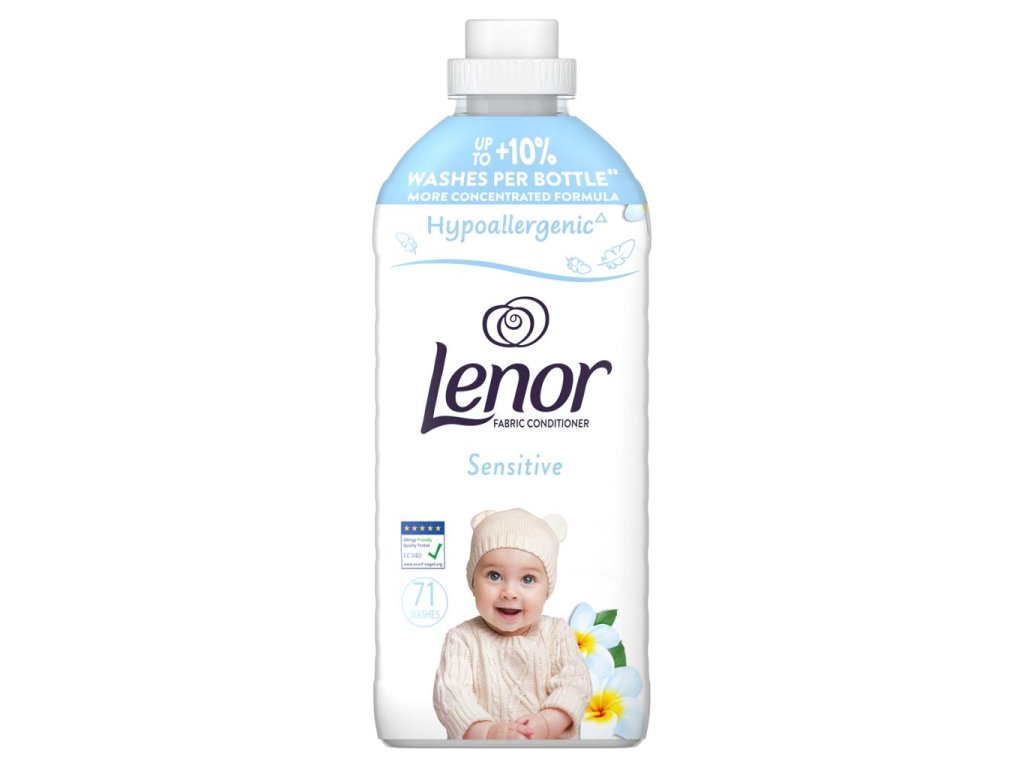 Hypoalergénna aviváž Lenor Sensitive poskytuje neutrálnu vôňu a nebeskú hebkosť. Zloženie je určené na citlivú pokožku, dermatologicky testované (test vykonaný na pokožke v kontakte s vypranou látkou) a certifikované Európskym centrom pre výskum alergií ECARF.