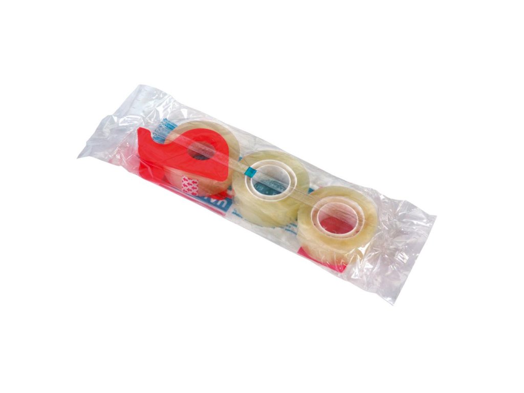 Univerzálna lepiaca páska vhodná do kancelárie, školy i na domáce využitie. Vyrobená z polypropylénu, odolnému voči žltnutiu. Vysoko transparentná, pri faxovaní a kópiách ich nevidieť. Silná substancia lepidla zaručuje dlhú trvanlivosť. Dodávaná v balení 3 ks s dispenzorom.