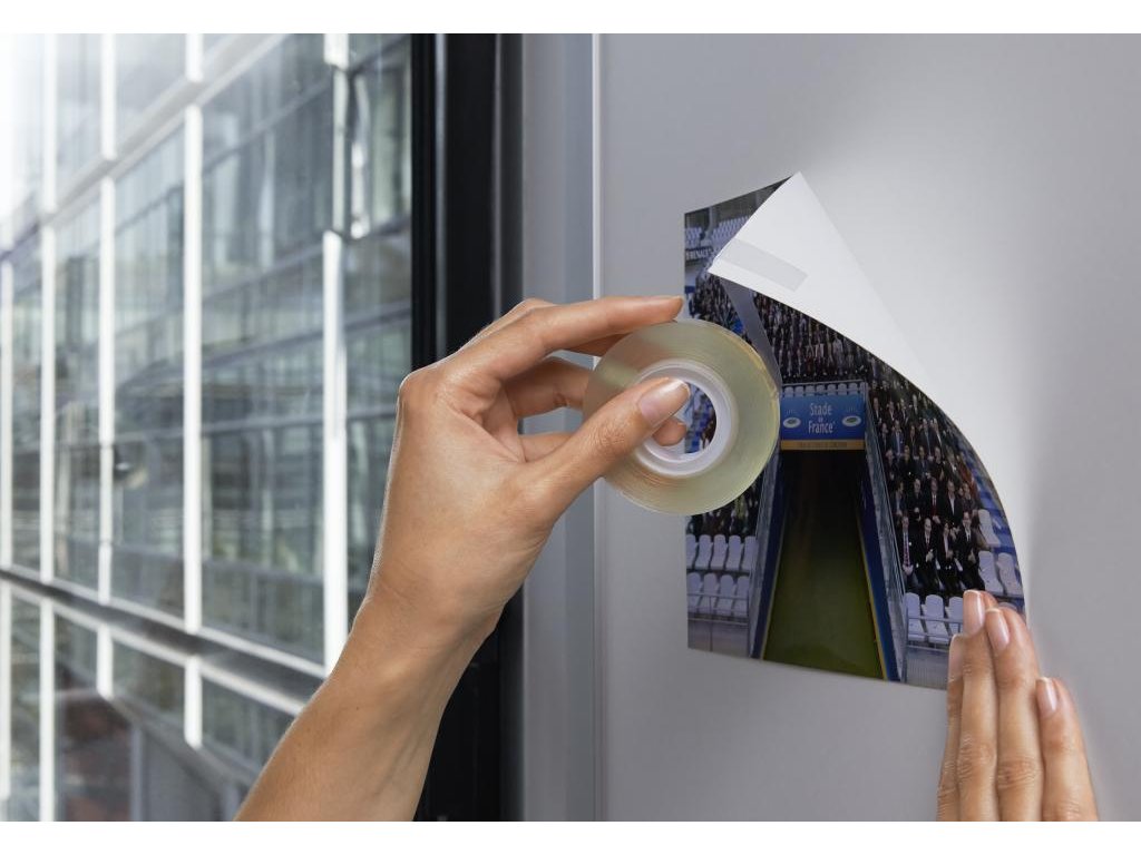 Lepiaca páska obojstranne pokrytá vrstvou lepidla, ľahko sa odvíja a strihá, je odolná voči vlhkosti. Vhodná na spájanie papierov, fólií, ľahkej lepenky, plastových materiálov, montáž plagátov, textílií, na zvislé povrchy. Dodávaná samostatne v krabičke.
