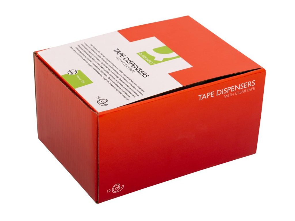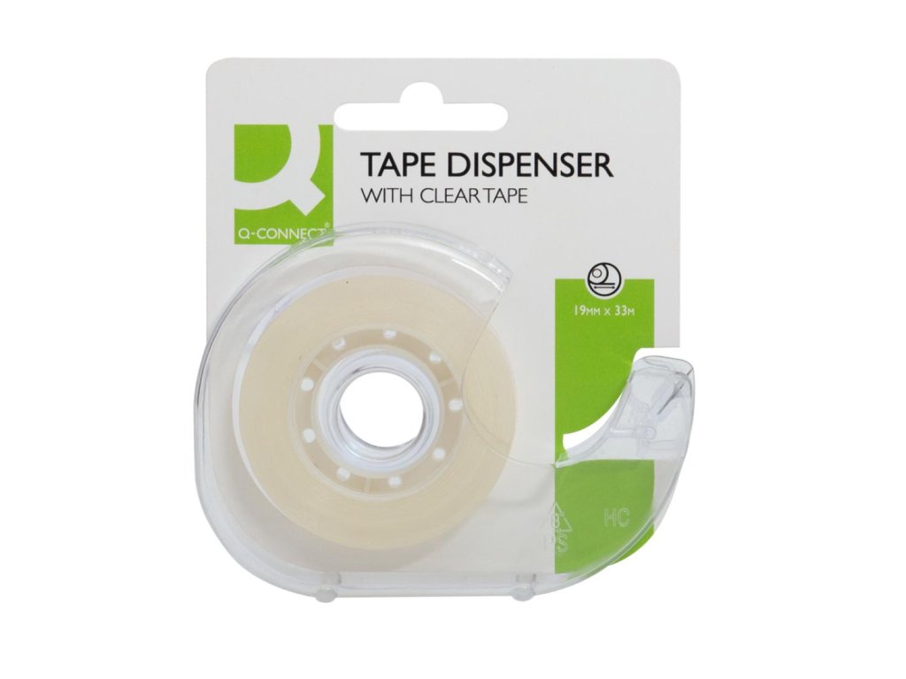 Priehľadná lepiaca páska Q-CONNECT rozmerov 19 mm × 33 m s dispenzorom. Dodávaná v mixe farieb bez možnosti výberu.