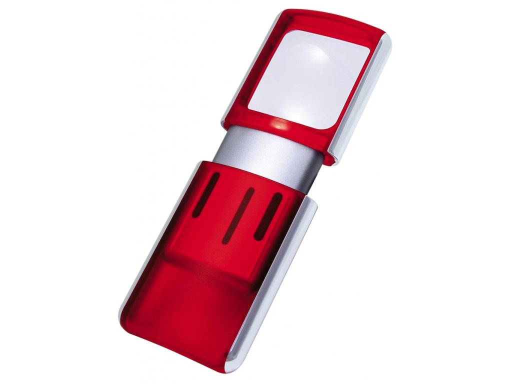 Lupa s podsvietením. Veľkosť cca 35×38 mm, 3-násobné zväčšenie. 2 batérie 3V sú súčasťou balenia.