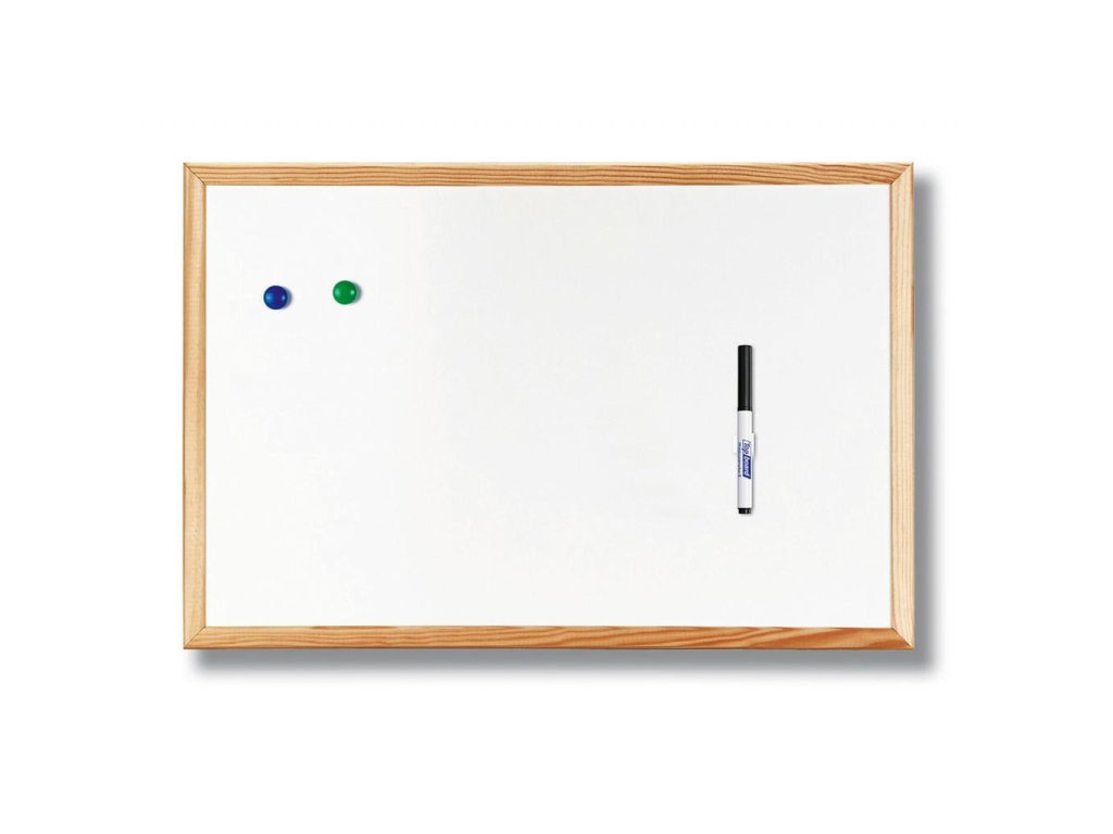 Biela magnetická popisovateľná tabuľa so svetlým dreveným rámom.