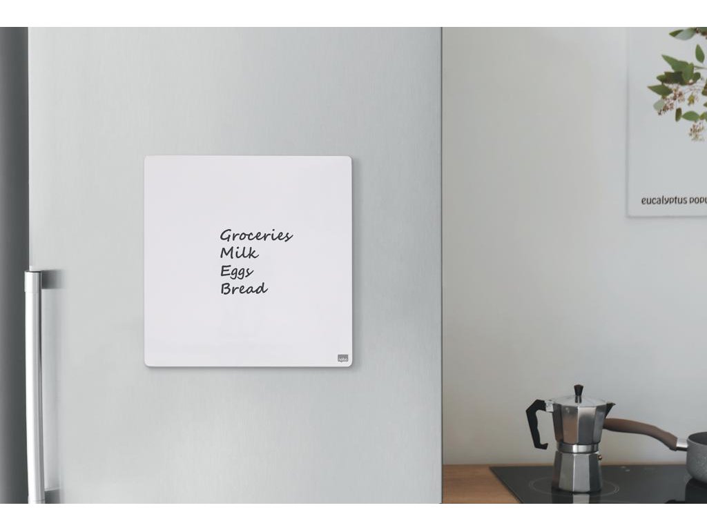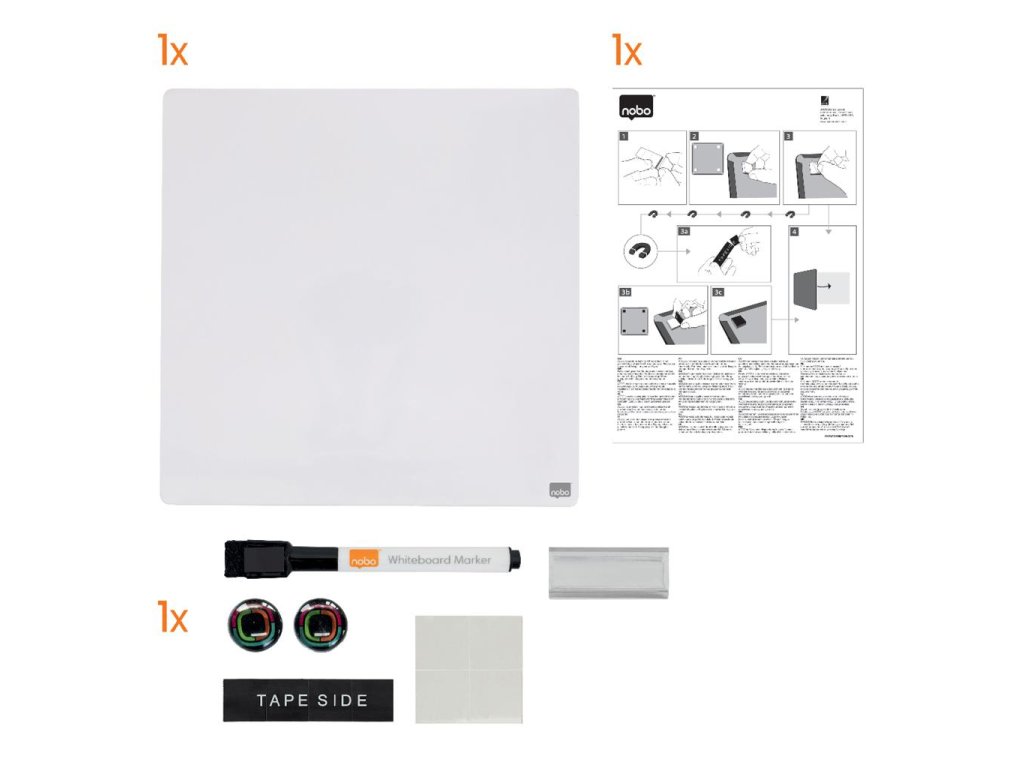 Magnetické, za sucha stierateľné tabule z bezrámčekových štvorcových dielcov Rexel. Obsahujú dva magnety, čierny magnetický popisovač ReWritable s mazacou hubou, montážne magnety a penovú lepiacu pásku. Modulárny systém - dajú sa kombinovať navzájom alebo i s ostatnými nástenkami a popisovacími tabuľami Rexel 360 × 360 mm. Farba biela.