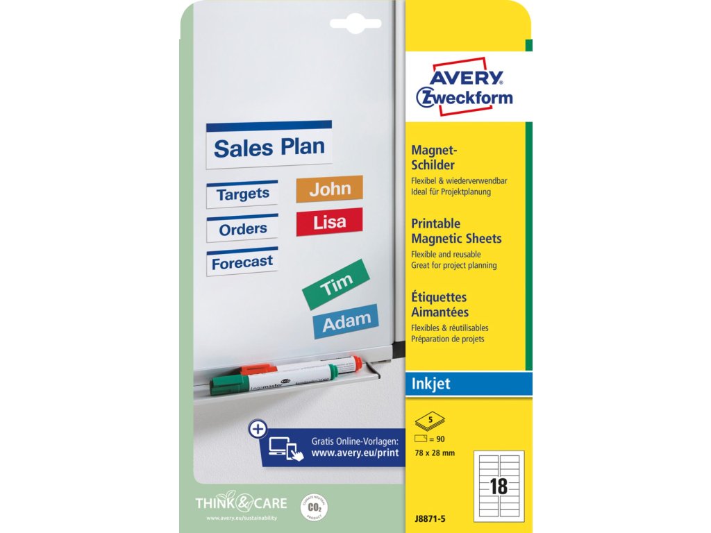 Vytvorte si magnety sami, pomocou vlastného počítača a tlačiarne. Na kovové regály, biele alebo magnetické tabule. Môžete ich ľubovoľne premiestňovať a opätovne používať. Flexiblné a jednoduché označovanie. Mikroperforované. V balení 5 hárkov. Na hárku 18 etikiet.