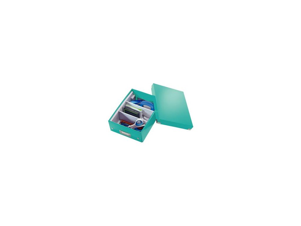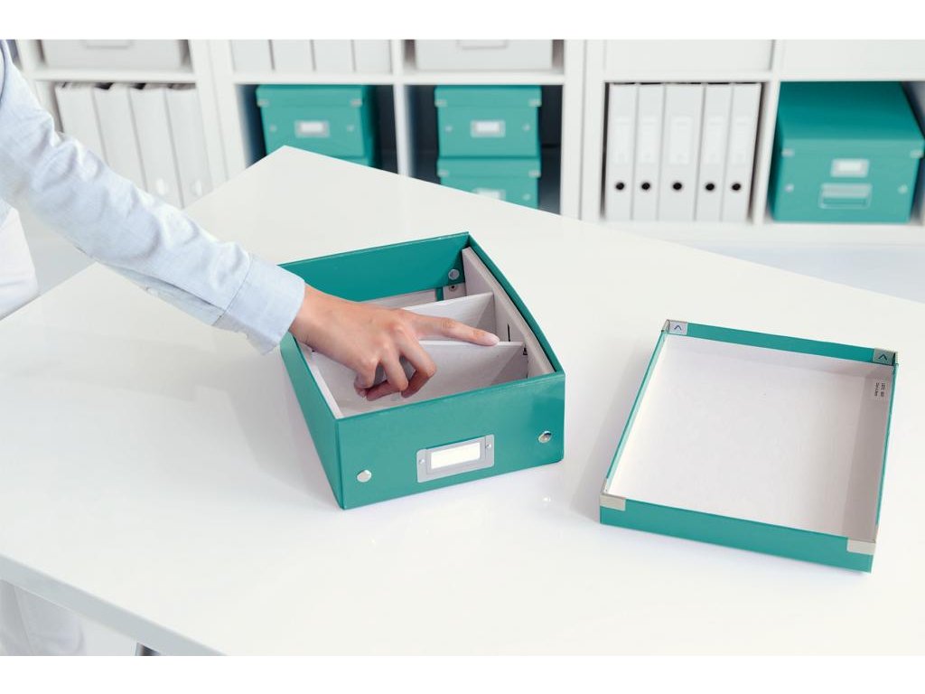 Malá štýlová skladacia krabica s vekom a s rámčekom na štítok. Na usporiadanie nabíjačiek, káblov a ďalšieho vybavenia kancelárie. Veľkosť S. Na prvý pohľad vidíte, čo sa vojde dovnútra! Výška krabice bola navrhnutá tak, aby vám poskytla dostatok priestoru na uloženie príslušenstva a zároveň zabránila skladaniu vecí na seba. Na vylepšenie usporiadania obsahu krabice použite priložený vnútorný systém priehradiek. Môžete rozdeliť krabicu na 2 alebo 3 časti a zabrániť tak miešaniu káblov alebo fotiek. Inteligentná skladacia konštrukcia: rýchle a jednoduché zloženie bez nutnosti použitia skrutiek a možnosť opätovného rozloženia na úsporu miesta, keď krabicu práve nepotrebujete. Moderný vzhľad a farby na skrášlenie vašej kancelárie alebo domova. Lesklé vyhotovenie vytvára prvotriedny vzhľad škatule a umožňuje dlhodobé používanie a jednoduché utieranie prachu. Rámček na štítok pre jednoduché označenie obsahu. Materiál pevný kartón potiahnutý polaminovaným papierom. Farba ľadovo modrá.