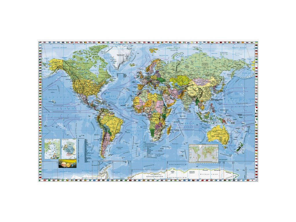 Nástenná mapa Svet politický je po celom obvode lemovaná vlajkami štátov.Na mape je vyznačené aktuálne politické rozdelenie dnešného sveta s hlavnými a väčšími mestami. Ďalej sa na mape nachádza mapka časových pasiem, vyznačenie morských prúdov, hĺbok a reliéf zeme. Mapa je vhodná na trvalé vyvesenie. Je obojstranne laminovaná a lištovaná.