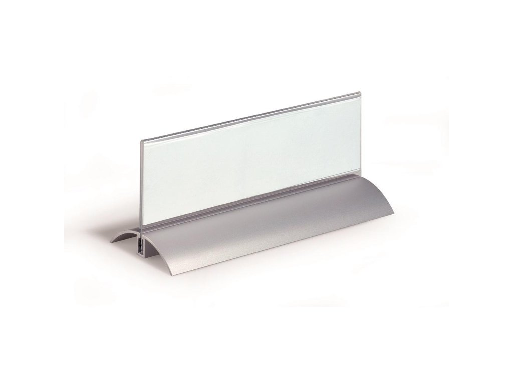 Štýlová stolová menovka s hliníkovým podstavcom. Unikátny uchytávací systém zabraňuje samovoľnému alebo neželanému vysunutiu menovky.Čítanie z oboch strán. Ideálna na konferencie, porady alebo miesta na styk so zákazníkom. Balenie 2 ks.