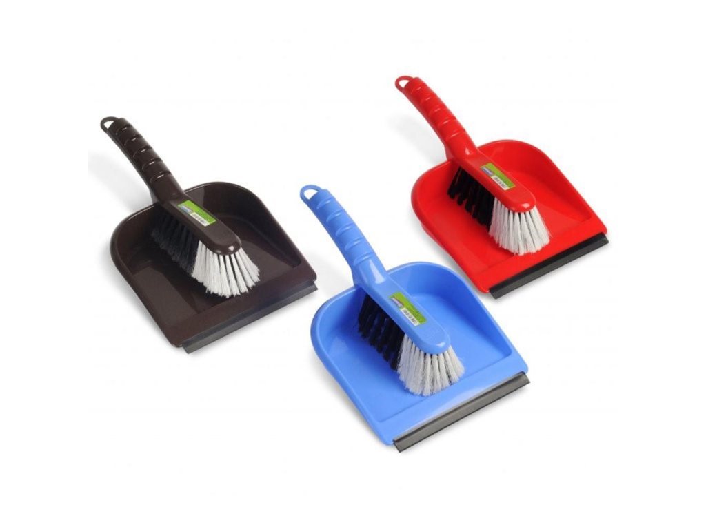 Súprava - metlička so syntetickými štetinami a lopatka s gumovou lištou. Mix farieb - hnedý, modrý a červený.