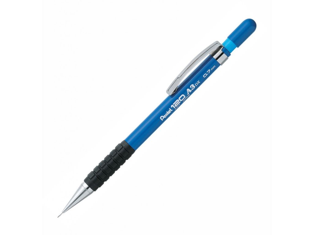 Obľúbený model mikroceruzky s extra dlhou špičkou. Ergonomická zóna pre pohodlné držanie, hrubý a zaujímavo tvarovaný klip. Dodávaná s 2 tuhami Hi-Polymer 120. Hrúbka tuhy 0,7 mm. Väčšie balenie 12 ks. Farba čierno modrá.