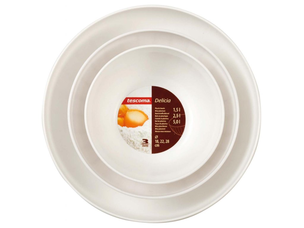Misy z prvotriedneho odolného plastu, vhodné do mikrovlnnej rúry a umývačky. V balení 3 ks - priemer 18, 22 a 28 cm. 3 roky záruka. Dodávané v mixe farieb.
